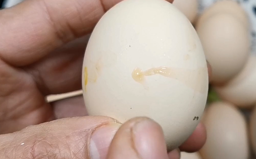 第三点,看鸡蛋蛋壳。在农村待过的朋友都知道,当母鸡刚把蛋生下来的时候,蛋壳上面有一层白霜,这才是最新鲜的鸡蛋。如果蛋壳上面出现黑斑,像这种黑点就是时间放久了的鸡蛋,不新鲜的鸡蛋。