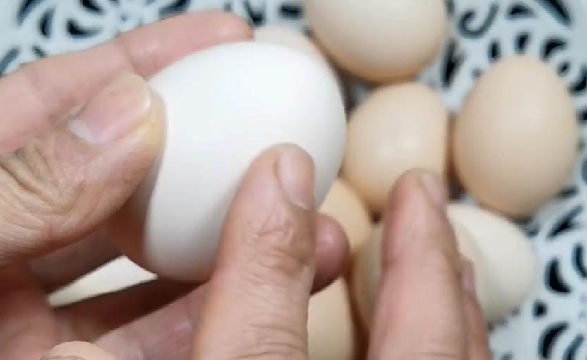 第二点就是用手摸找手感。一般新鲜的鸡蛋外壳都会比较粗糙,摸起来有点像鸡皮疙瘩的感觉,有的人还以为这种鸡蛋不好。其实恰恰相反,这种鸡蛋的存放时间较短。
