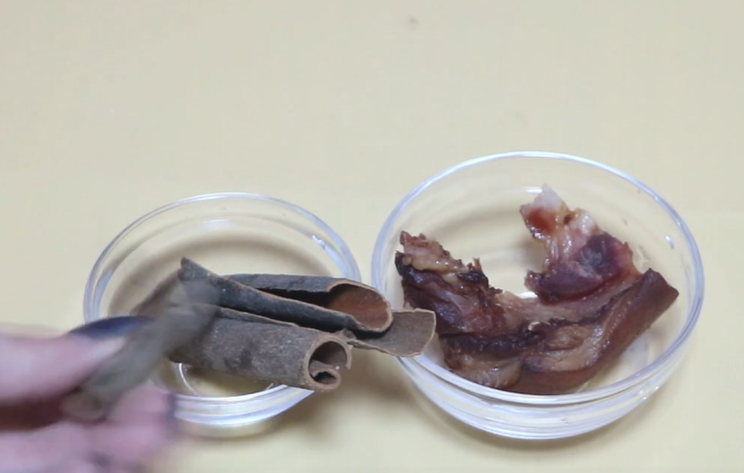 第一种材料,就是桂皮,桂皮这个香料,大家应该不会陌生,因为在日常生活中,我们做很多菜都会用得到它,这是因为我们的桂皮,它本身有一种特殊的香气,可以遮盖住肉类的腥味和膻味,不过桂皮是一种热性的调味品,我们最好少放一些。