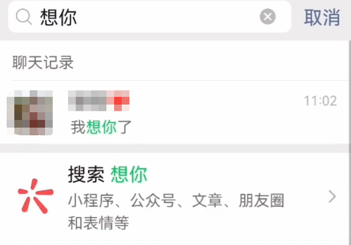 首先,我们需要拿到对方的手机,然后把锁屏密码给它解开,咱们就点开对方的微信,然后点击右上角的放大镜图标,这个时候输入我们想要搜索的字眼儿,比如说搜索想你这个字,要看看他都跟谁说过,我们就看看聊天记录,这里就出来啦。
