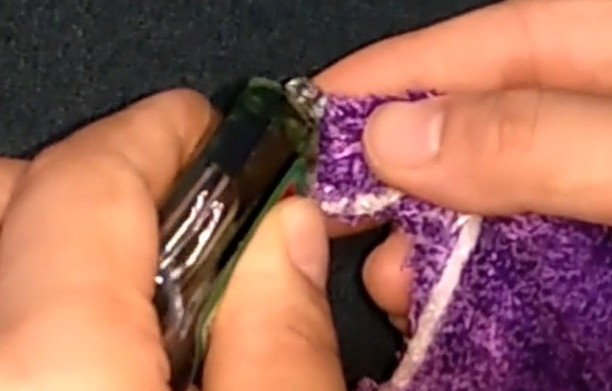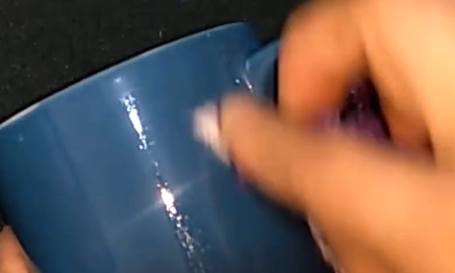 接下来我们找了一块抹布,你只要用了这个抹布的一小角就可以了,把这个风油精得得得给它滴到这个抹布的一角上面,给它滴湿滴透。接下来我们再看一下这个马克杯,马克杯上面也是一样,有一层粘胶在上面,这个粘胶它是油性的,这个时候我们再给它擦擦,大家有没有看到,非常轻松就把这层油给擦掉了,而且特别特别的亮,一下子就没有了,非常好用。