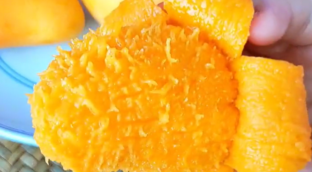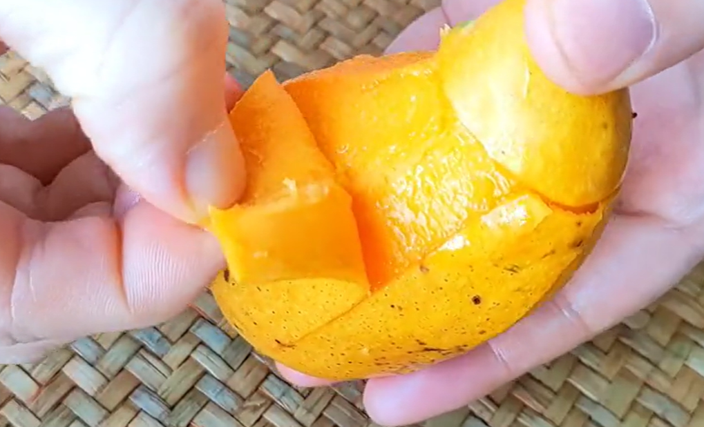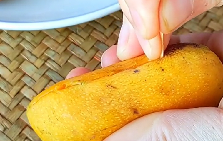 刮完之后我们再来剥开看一看,和刚才的结局完全不同,非常轻松的就可以把芒果皮剥掉了,而且毫不费力地就拨下来了。剥好之后这样直接拿着吃是不是非常的方便呢?