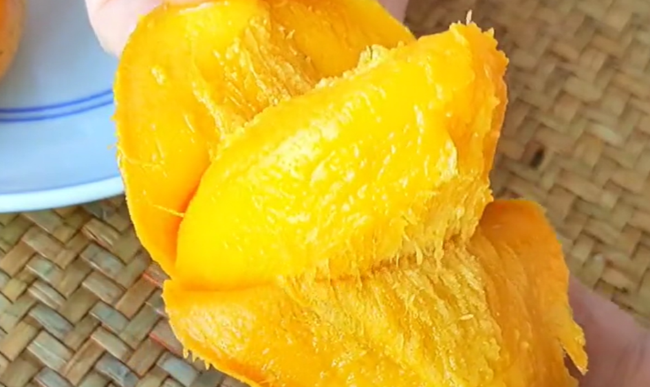 我们就可以非常轻松地捏住皮,把它剥开,金黄的果肉就展现在我们的眼前,这样拿着吃也是非常的方便,