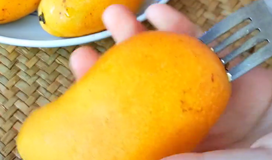 第二种方法,找一把家里吃饭用的叉子,直接插入芒果的底部,
