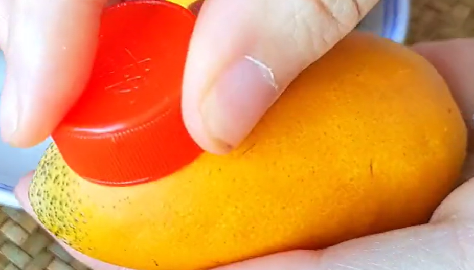 我们先分享第一种方法,找一个瓶盖儿就能轻松搞定,像这样刮一刮,刮过之后的芒果皮颜色会立刻变深,我们把整个芒果都刮一遍,刮完之后芒果好像没有什么变化,但是摸一摸已经变软了。