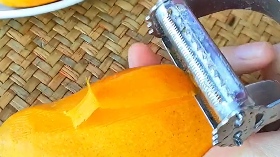 再用削皮刀直接给芒果削去外皮,这样削起来也非常的方便,整个过程也不会流出汁水,还可以在上面划上几刀,这样就得到了一个非常漂亮的玫瑰芒果,非常的漂亮好看,不用接触手,干净又卫生。