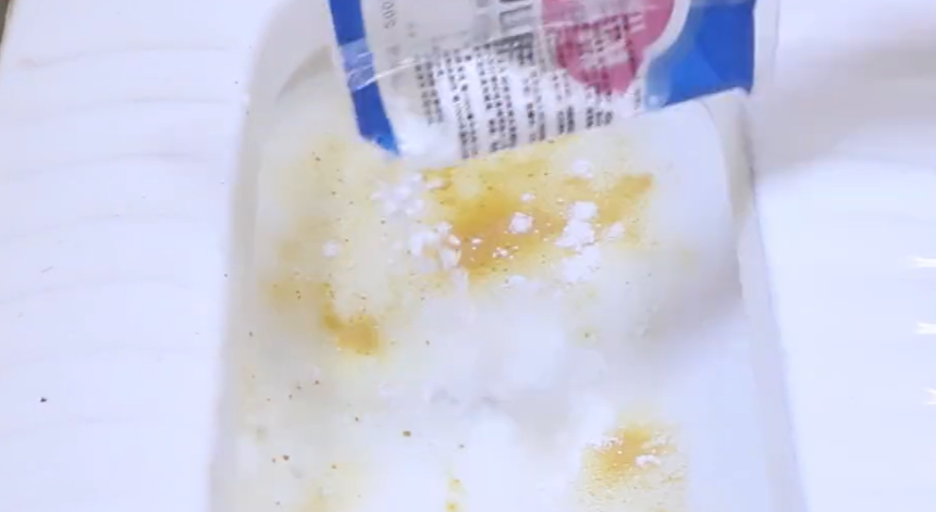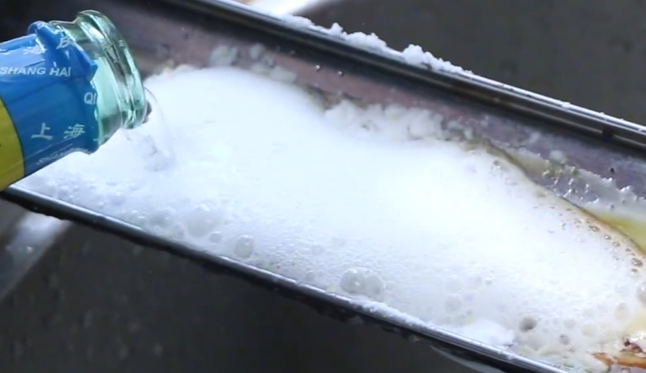然后我们将白醋给它倒进去,白醋小苏打产生化学反应,让它静置两分钟哦,这是因为小苏打和白醋,会产生化学反应,形成二氧化碳,就可以快速的去除油污,同时白醋里面有醋酸,可以软化油污,小苏打去油污能力非常的强,两者双管齐下,油污垢立马去除。