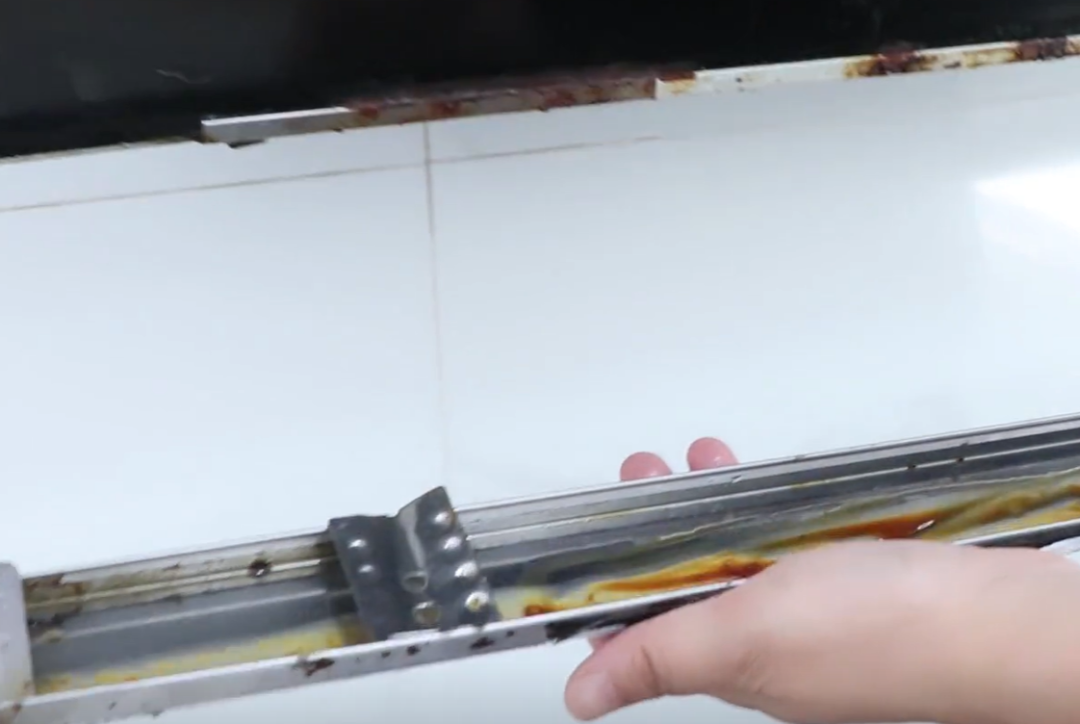 第四个妙用,小苏打可以快速的清洁油烟机里面的油盒,大家可以看到油盒里面有很多的油污,非常难清洁,我们可以借助小苏打来帮忙。接下来,我们将小苏打粉末,撒在油盒里面,我们多撒一些哦,