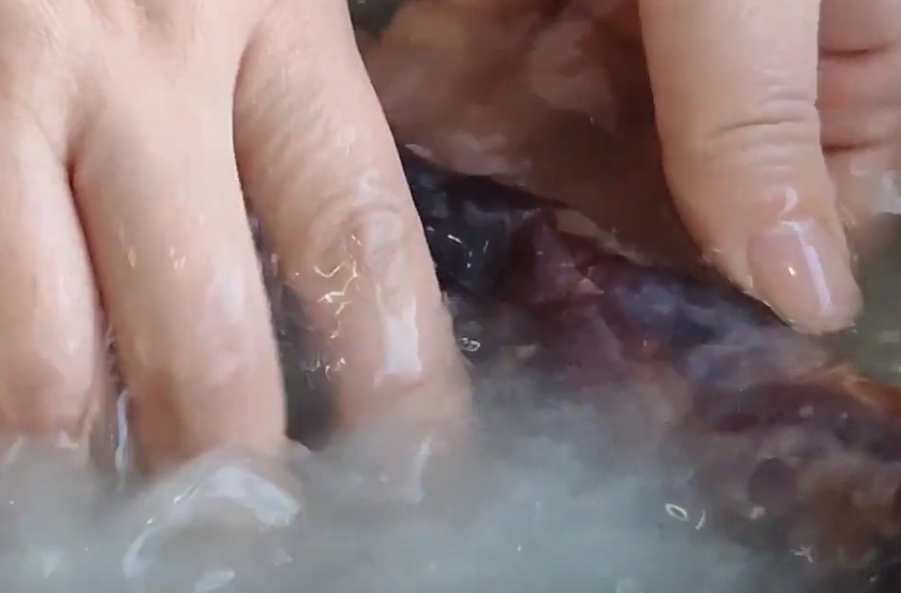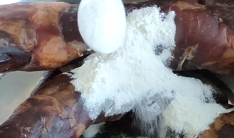 然后倒入温水,把香肠清洗一下,因为香肠在晾晒的过程中,表面会沾上灰尘和脏东西,面粉能吸附香肠表面的灰尘和脏东西,食盐具有消毒杀菌的作用。