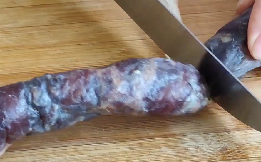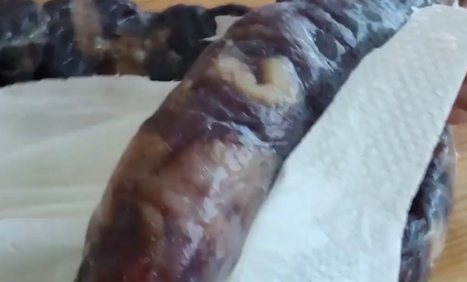 也可以用厨房纸把表面的水分擦干,全部擦干后,我们再把香肠从分段处切开。