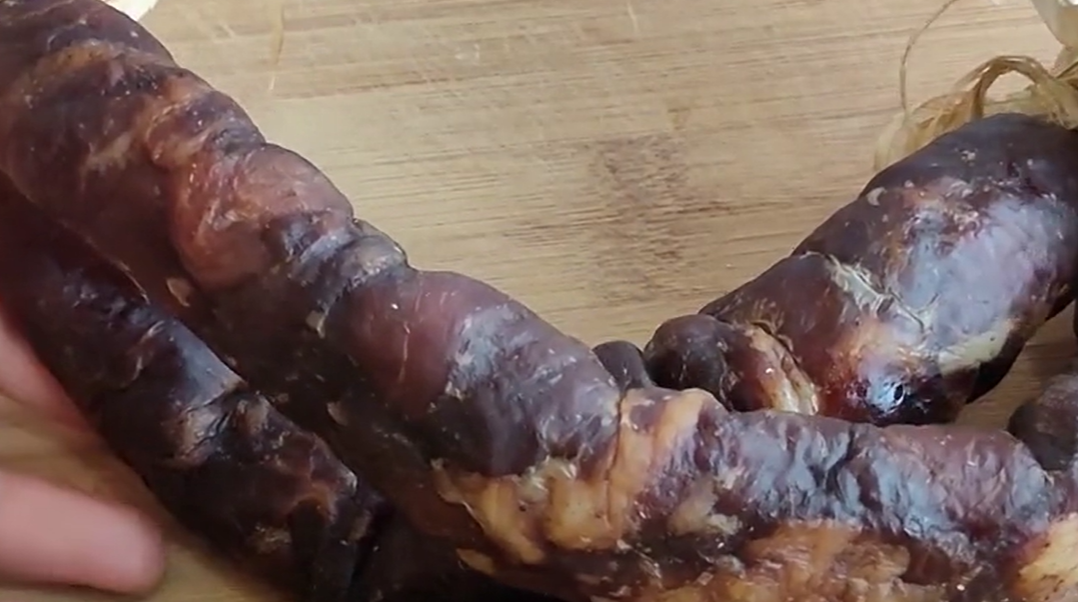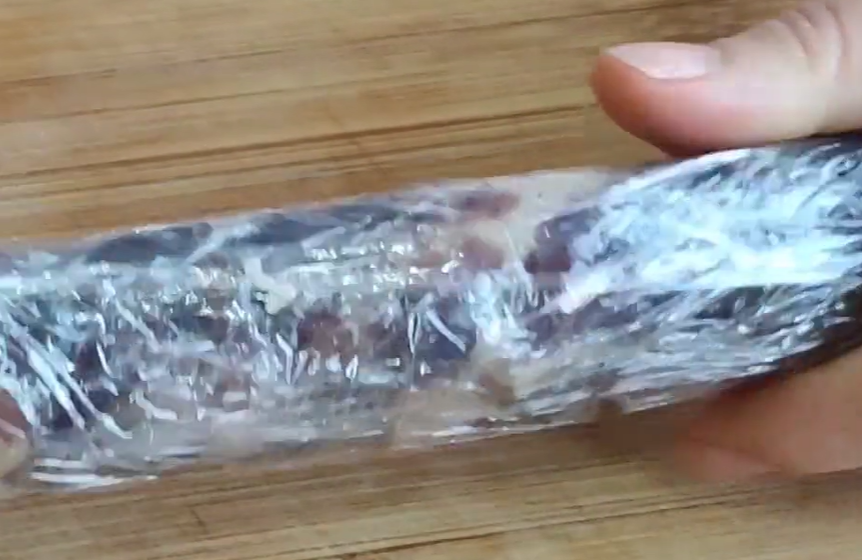 白酒具有消毒杀菌的作用,这样在储存的过程中能避免滋生细菌。一整根都刷好后,再把香肠放在保鲜膜上,从一头把它卷起来,排出里面的空气,包得紧实一些,这样香肠在真空的包装里,表面又刷了高度的白酒,这样储存起来就不会变质了。