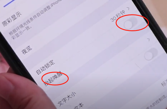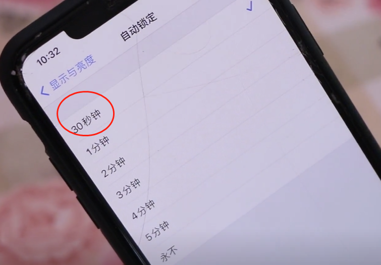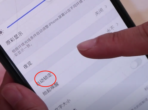 第四,我们还需要设置一下自动锁定,也在显示亮度里面打开自动锁定,大家可以看到有很多个选项,我们不能选永不,如果说我们手机在不玩的时候,手机一直处于亮屏的状态下,不会自动锁定,消耗电量非常的大,
