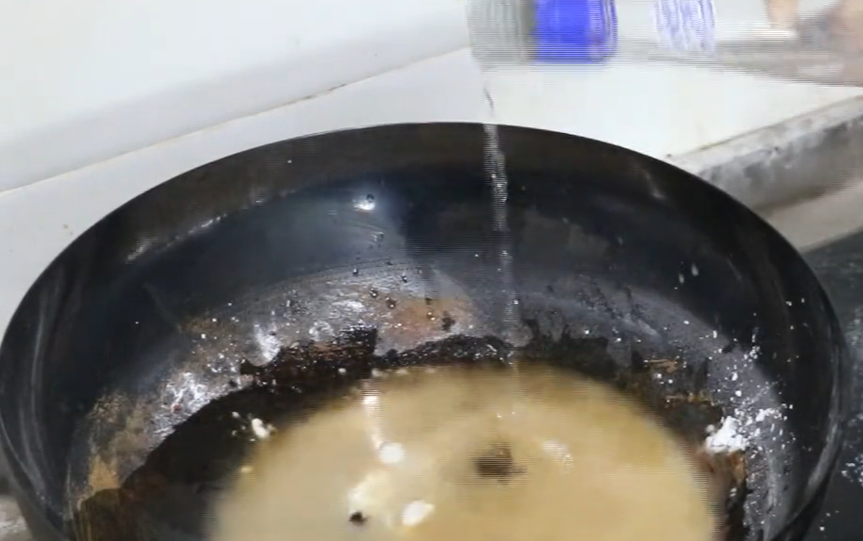 时间到,大家看,上面的黑垢已经被分解下来了,关火把他给倒出来,然后再用百洁布稍微清洁一下,给它冲洗一下。大家看,我们只需要轻轻的刷试上面的黑垢很轻松的就被刷下来了,而且毫不费力。