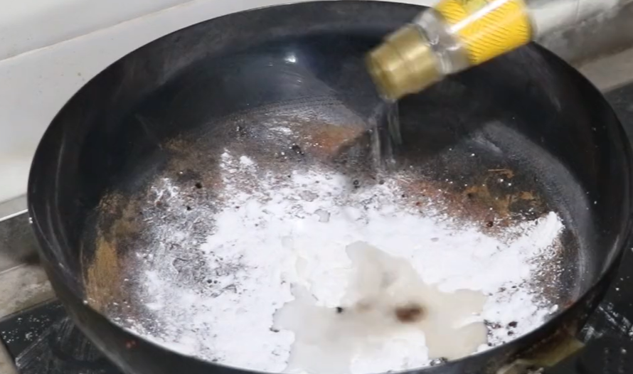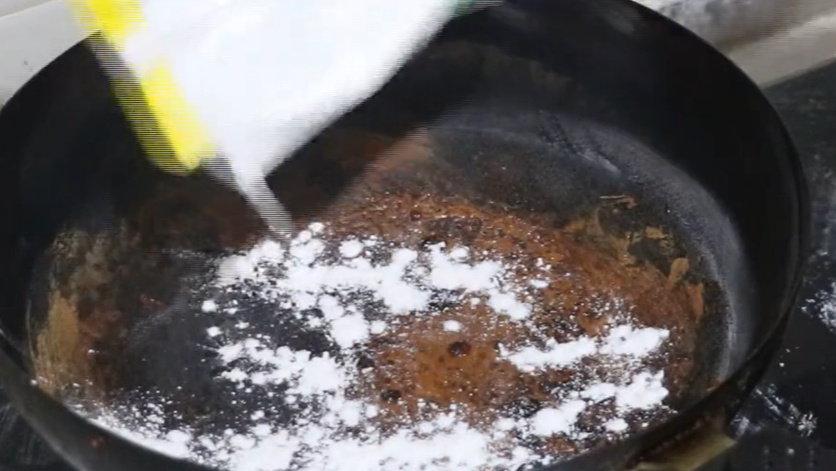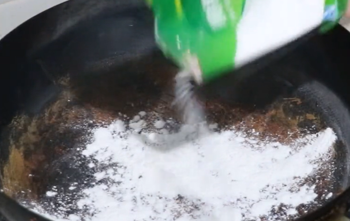 这个时候我们可以在里面撒上一些淀粉,淀粉能够很好的吸附里面的黑垢。接着在里面撒上一些食用面碱,
