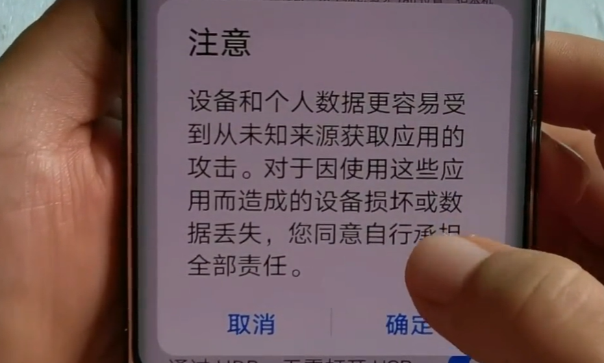 大家可以看一下自己的手机这个功能外部来源应用检查这个功能有没有打开,没有打开的话,需要把它打开就可以啦。上面这里的外部来源应用下载,它默认是关闭的状态,如果说,您不小心把这个开关打开的话,它这里,也会有注意事项的提醒,也就是我们设备和个人数据更容易受到从未知来源获取应用的攻击。