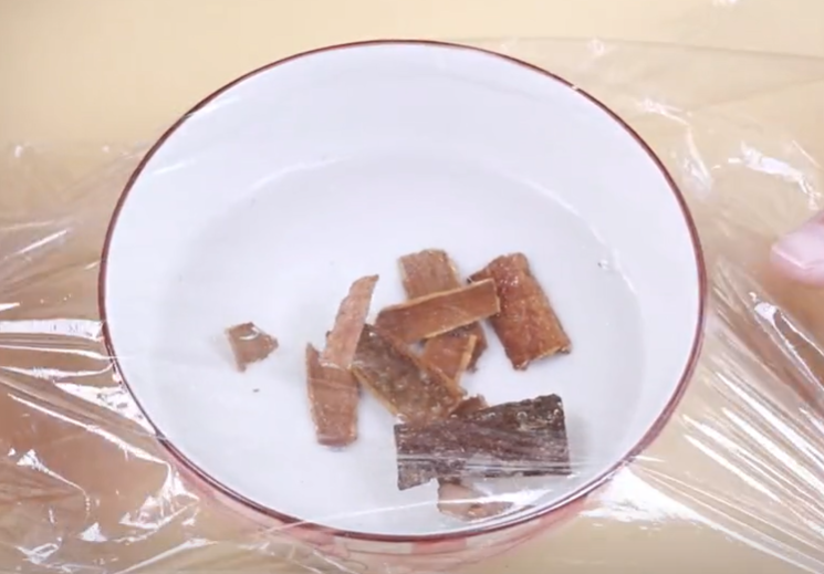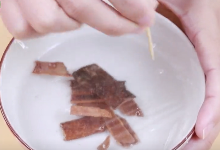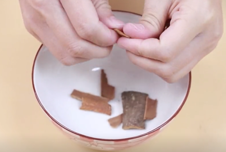 桂皮的第一个用途,我们还可以用来去除冰箱里面的异味。首先我们将桂皮给它掰成一半儿一半儿的,掰好之后放入碗中,