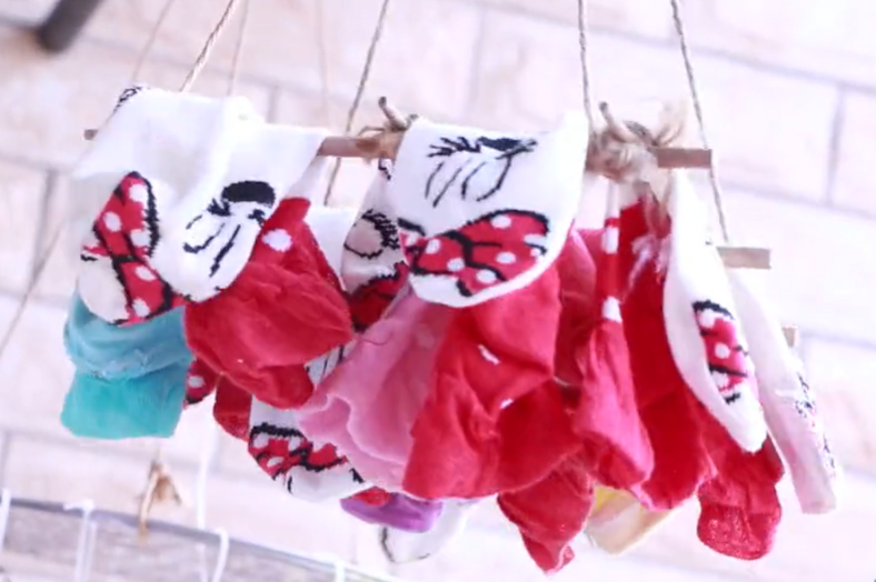 接下来准备四根长度一样的绳子,分别将四个外角依次固定起来,绑牢固就可以了。将做好的晾晒袜子神器,挂在阳台。