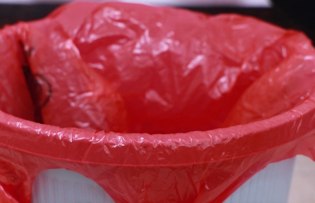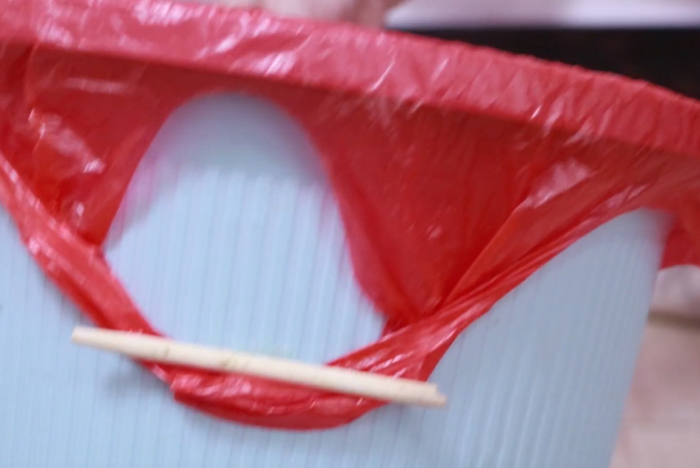 全部固定好之后我们就可以用来套垃圾袋了,直接将垃圾袋给他套进去,我们直接将塑料袋的提手给他固定在筷子上面,这样垃圾袋就不容易下滑,也不会弄脏垃圾桶。