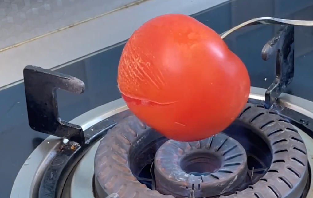 首先拿出家里面的叉子在西红柿蒂的这个位置戳进去,这一步主要是为了用来固定西红柿,接下来把厨房的煤气打开,开到小火,然后我们将西红柿放到火上烤一烤,烤的时候均匀的转动西红柿,只需要烤20秒左右,西红柿遇热,外皮就会自己破开了。你看西红柿的外皮已经预热收缩了,现在的西红柿皮一撕就整块的掉下来了,经过高温烤后,西红柿表皮也会越绷越紧,跟着过不了几秒钟就会自己剥裂开,这就是利用了热胀冷缩的原理。高温下的西红柿就会自动爆裂,去皮效果非常的好,而且去的皮非常的薄,一点果肉都不会浪费。用这种方法不仅快速,而且效率高,特别适合大批量的去皮。