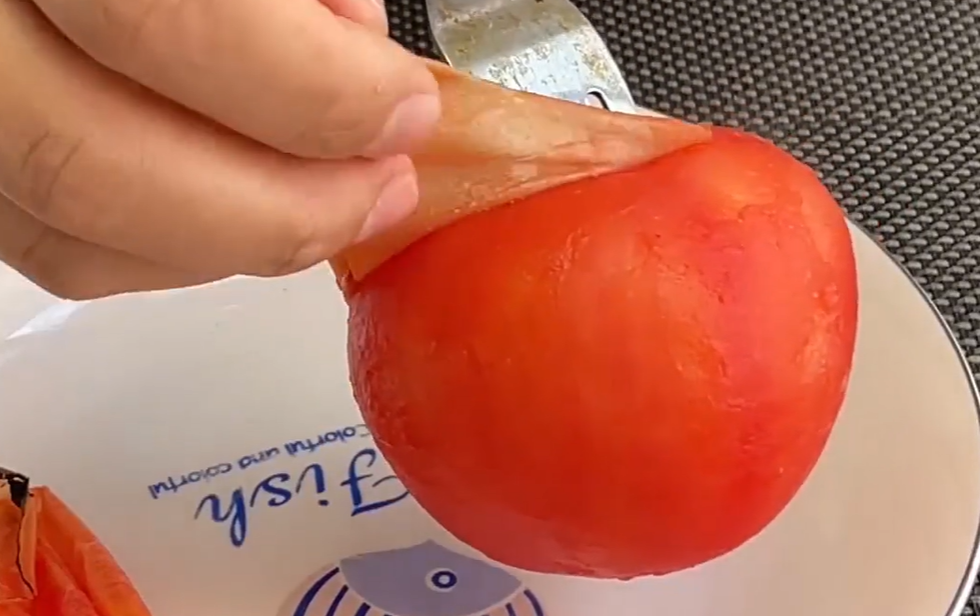 一样的方法,我们用刀切个十字花刀,现在就可以直接去皮了,也是很轻松的就可以把皮撕下来了,而且感觉撕下来的皮更薄,唯一的缺点就是有点儿费手指,其他没有任何问题。都是操作简单易上手,我们这样搓一搓就相当于把果皮和果肉给他搓开了,所以后面我们撕皮的时候就特别容易撕开了,是不是特别棒呢?