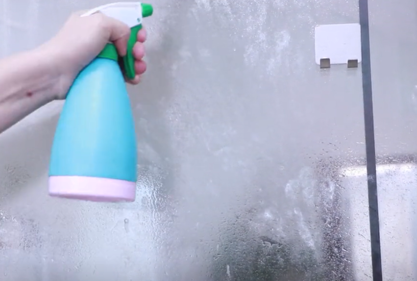 第四个用途,牙膏啤酒的溶液还可以用来清洁玻璃,大家可以看到厨房的玻璃非常的脏,有很多的油水渍,我们直接将这个溶液喷洒上去,