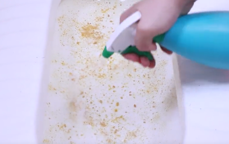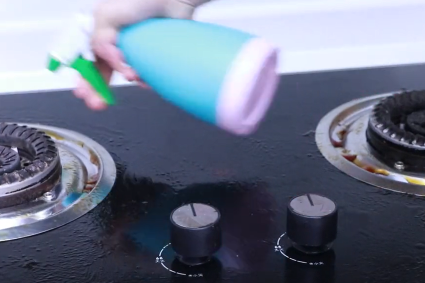 第一个用途,可以拿去厨房用来清洁灶台油,效果非常不错。大家可以发现家里灶台要是一段时间没去清洗,灶台上就会积上厚厚的一层油污。大家不用担心,直接用上啤酒牙膏水的溶液给它喷洒上去,给他静置两分钟。