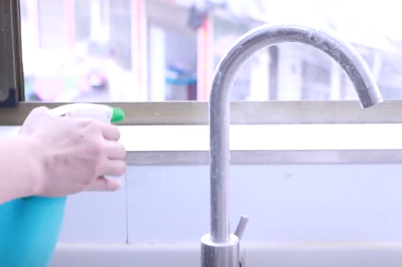 第二个用途,可用来清洁厨房的水龙头,水龙头在厨房里非常的脏,而且积上了一层厚厚的污渍,直接将这个溶液喷洒上去,两面都给它喷洒一些,