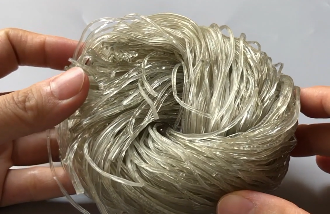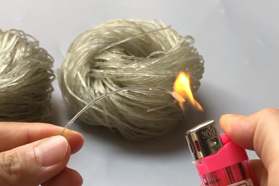 接着呢,我们可以用打火机烧一下,真的红薯粉很容易就点燃,但是燃烧的速度很慢。而假的红薯粉点燃后燃烧速度非常快,就像烧塑料条一样,如果不放心,我们可以把红薯粉煮一下,真的红薯粉煮完后轻轻一夹就会断,而假的红薯粉久煮不烂,用筷子都夹不断的。所以大家在购买粉条一定要辨别清楚,避免买到甲醛粉条。