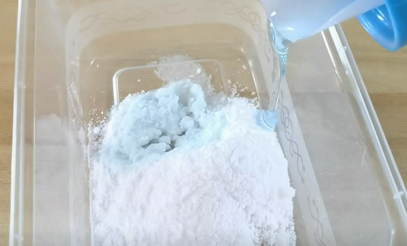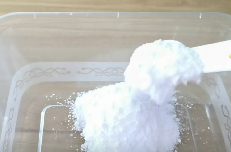 接着我们来调洗床单的溶液,先往小盒子中加入两大勺的食盐,食盐不仅有助于杀菌,而且它有固色的作用。像我们平时买的一些新衣服,牛仔裤之类的,洗之前一定要用盐水泡一泡,这样不掉色。接着再往里面加入两大勺的食用碱,食用碱有非常强的去污作用。