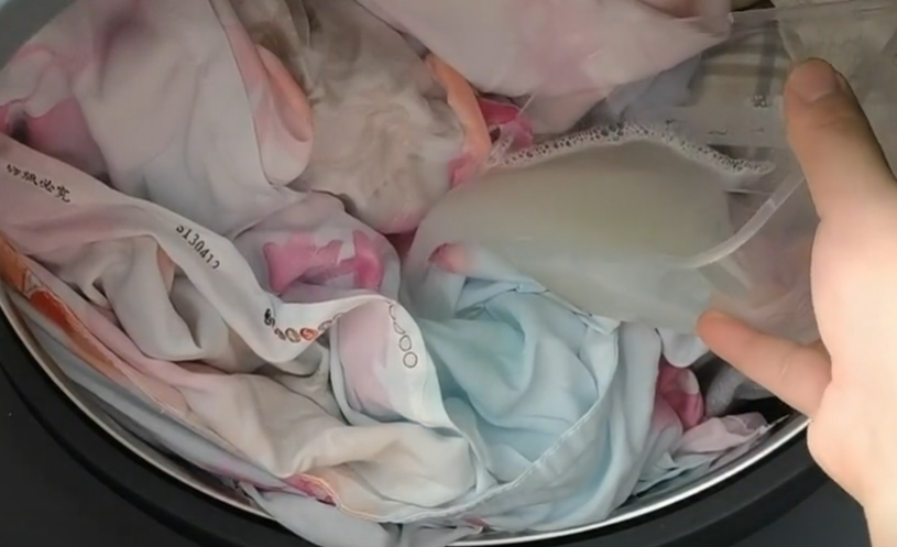 把我们调好的溶液直接倒在洗衣机里面,倒好之后,我们这里面就不用再加洗衣液之类的,关好洗衣机的舱门儿就可以直接去洗。