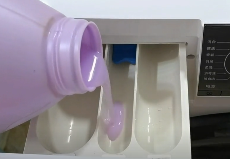 接着往里面加入一些洗衣液,洗衣液的量按照您家里面需要洗衣服的数量酌情增减。