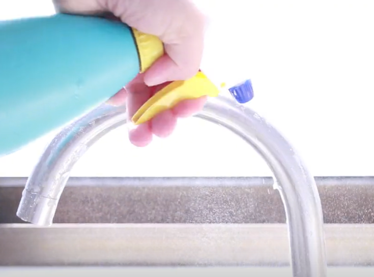 第二个用途可以用来清洁水龙头上有水垢,效果非常棒。大家可以看到厨房的水龙头上有很多的油水渍,我们直接将白醋洗衣粉的溶液给它喷洒上去,让它静置两分钟就可以了。白醋能够软化污垢,洗衣粉的去污能力非常的强,两者双管齐下,水龙头上有水渍快速溶解,