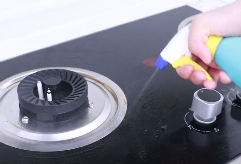 第一个用途可以用来清洁灶台油污,效果非常不错。大家可以看到灶台上有很多的油污垢,看起来非常的脏。不用担心,我们直接将白醋洗衣粉的溶液喷洒上去,让它静置两分钟后。大家可以发现灶台上的油污垢都溶解了,这是因为白醋里面含醋酸,可以软化油垢,洗衣粉的去污能力非常的强。