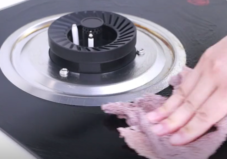 接下来,我们直接用抹布一擦,油污很轻松就能擦掉。我们将整个灶台给它擦拭干净,