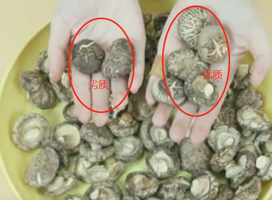 第二,在购买香菇的时候,可以看一下香菇的颜色来分辨。外表皮颜色比较深黄色,还稍带一点白霜的,一般是品质好的干香菇。颜色是紫红色的干香菇,就证明这种香菇放置的时间已经远远超出了正常的保存时间。虽然说干香菇可以放很久,但是已经变成紫红色的话,就说明已经放太久了,口感明显已经非常不好了,而且比较难泡发,营养价值也不多,所以大家避免购买颜色是紫红色的干香菇。