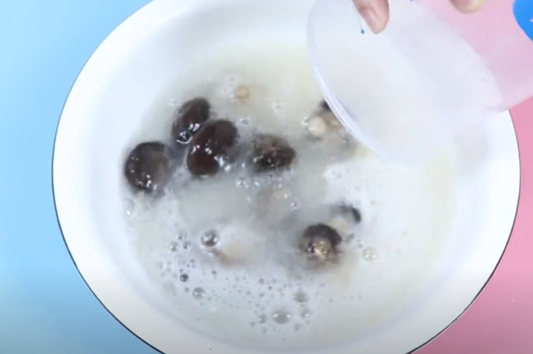 泡发香菇我们一定要用温水,千万不能用热水,热水会导致它的营养成分流失,用冷水泡不开,我们用温水就可以。温水加好之后,我们还需要在里面加入两样好宝贝,