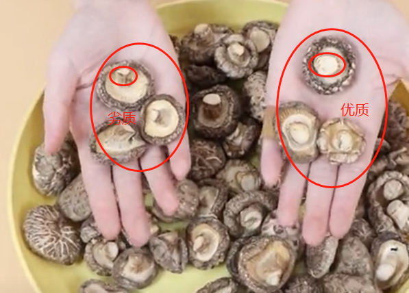 第三,我们在购买香菇的时候,可以观看一下香菇的菌柄部位。品质好的干香菇的菌柄是短而粗大的,一捏起来有一些硬的感觉,吃起来口感也是比较厚实的。如果是菌饼比较小,就是品质不够好的香菇晾晒而成,而且它的香菇菌饼非常的脆弱,这种干香菇买回去做成菜品之后,吃起来口感并不好。