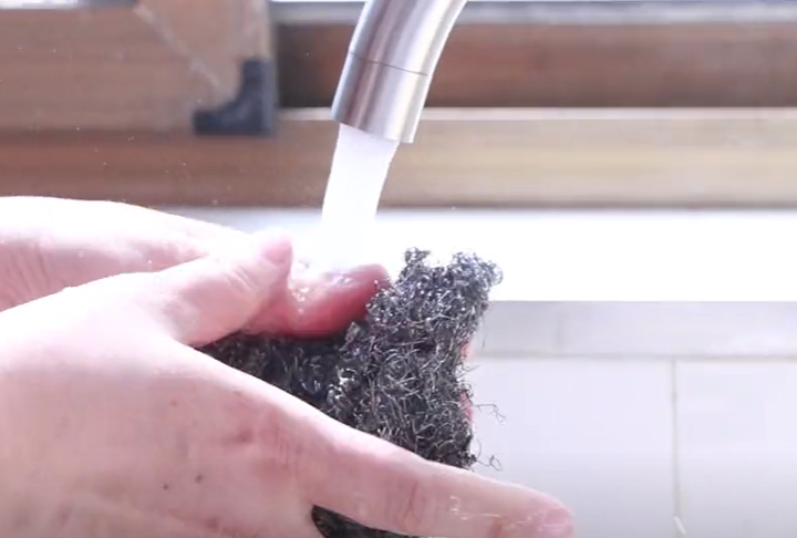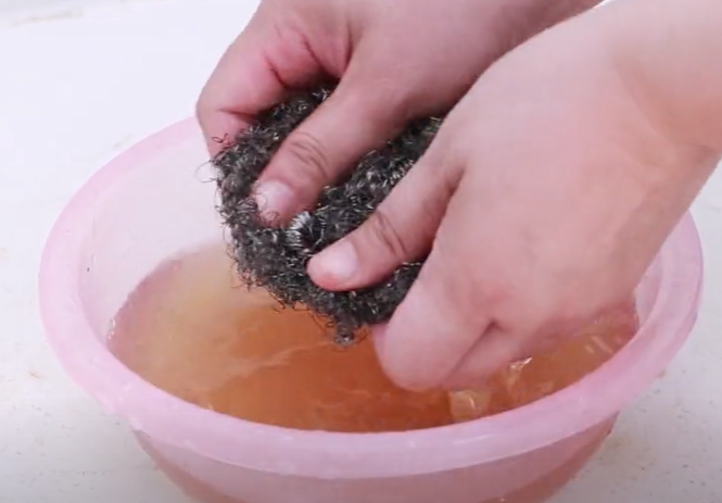 我们把烤好的钢丝球直接把它放到清洁溶液当中,给它浸泡十分钟就可以。这是因为食用碱的去油污能力非常的强,同时可以快速地将钢丝球里面油污垢浸泡出来,而且不会伤害到我们的手。