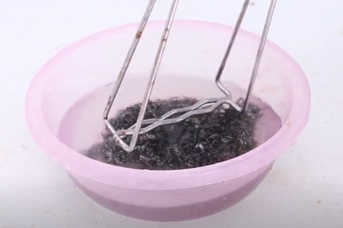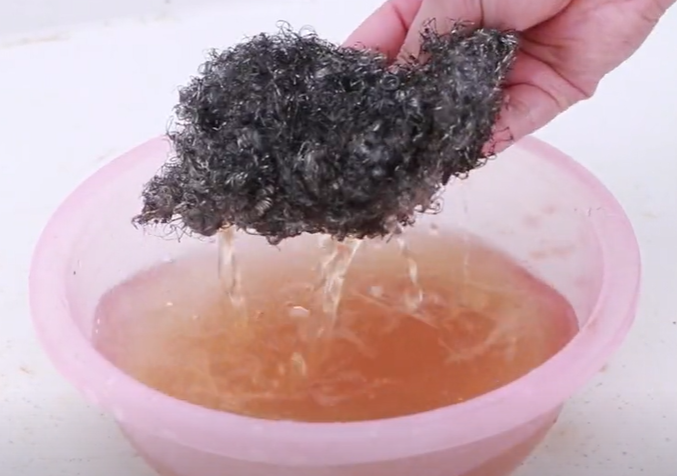 浸泡十分钟过后,大家可以看到钢丝球上面的油污全部都溶解出来了,钢丝球也变得干净了许多。