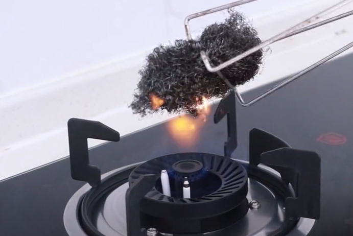 我们直接开小火,将钢丝球放在火上烤一烤,烤个30秒,利用高温消毒杀菌,将油污给它烤溶解就可以了。