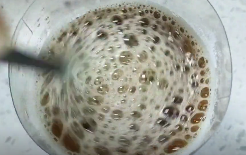 随着不断的搅拌,我们可以看到这个红糖水表面出现了许多的泡沫。搅拌成这个样子就差不多了,先放在一旁备用。