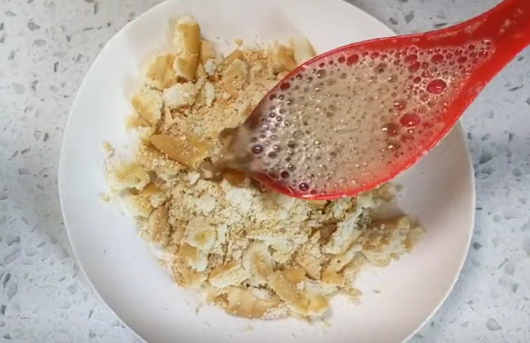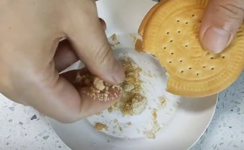 接着再准备一点家里面的饼干,将它掰成小块儿。
