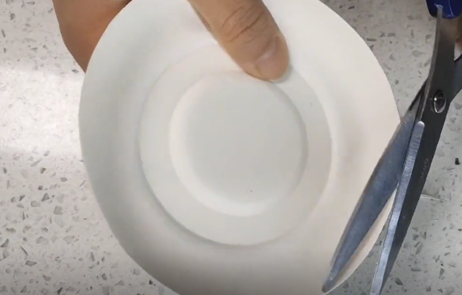 接下来准备一个一次性纸碗,我们用剪刀将它修剪成一个盘子的形状。