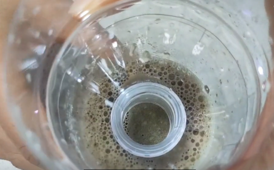 除此之外,我们刚才调好的洗衣粉红糖水还有其他的作用,我们把刚才剪下来的有盖子的这一部分,将盖子拧开,把它装在装有红糖洗衣粉水的瓶子上,