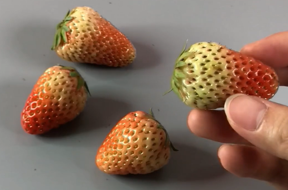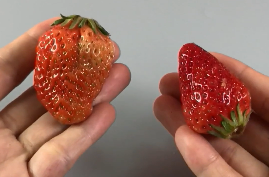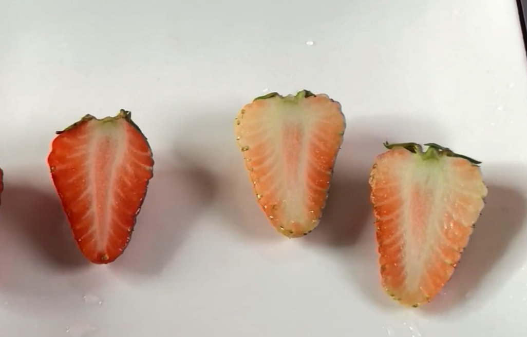 三、切一刀。把草莓切开,看果肉里面的颜色,正常成熟的草莓两边的果肉比较红,而且中间这部分是粉红色或者白色的,如果切开后发现里面全是红色的,它肯定是添加了激素种植地,发现这种情况的我们就千万不要再吃了。