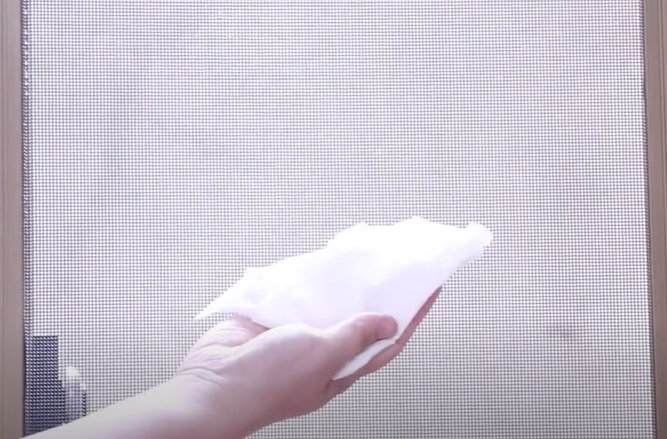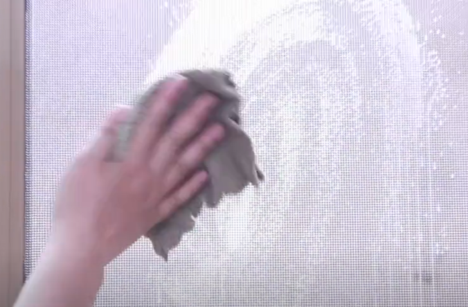 接下来我们准备一块干抹布将整个纱窗给他擦拭干净,纱窗全部清洁干净之后变得没有任何灰尘跟油污,