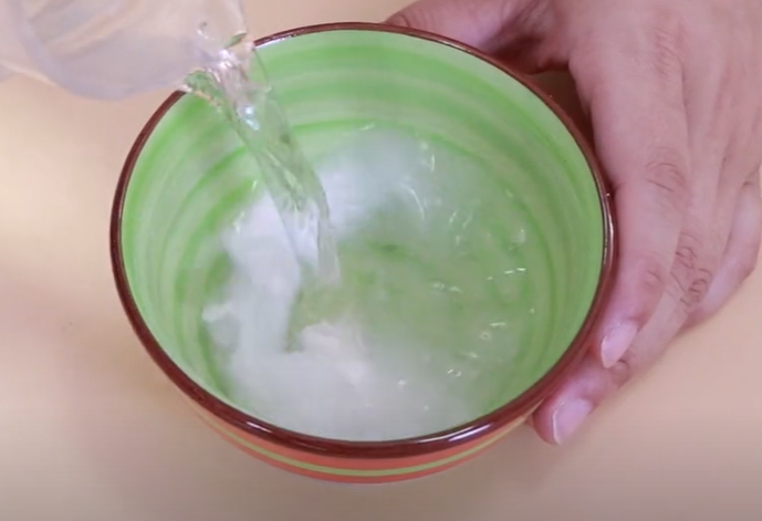 接下来在里面加入一碗清水稀释一下。直接用筷子搅拌溶解,然后就可以拿去利用起来了,我们直接将调好的溶液倒进喷壶面,就可以拿去清洁纱窗了。