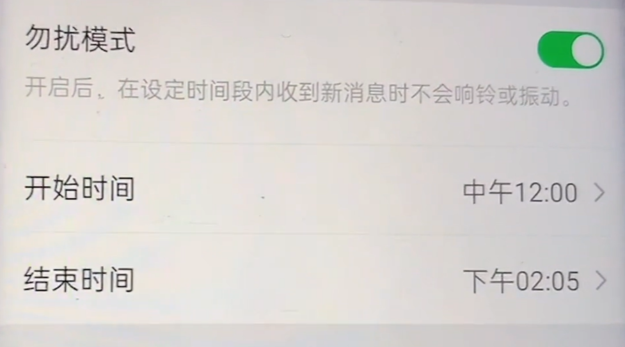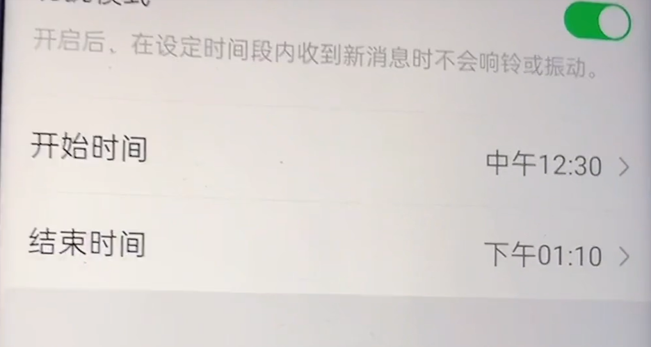 可是大家看到了吗?勿扰也不要打扰的意思吗?咱们点击进去,现在他没有开启,是灰色的一个图标,开启后会怎么样?开启后再设定时间段内,收到新消息时不会响铃和震动。