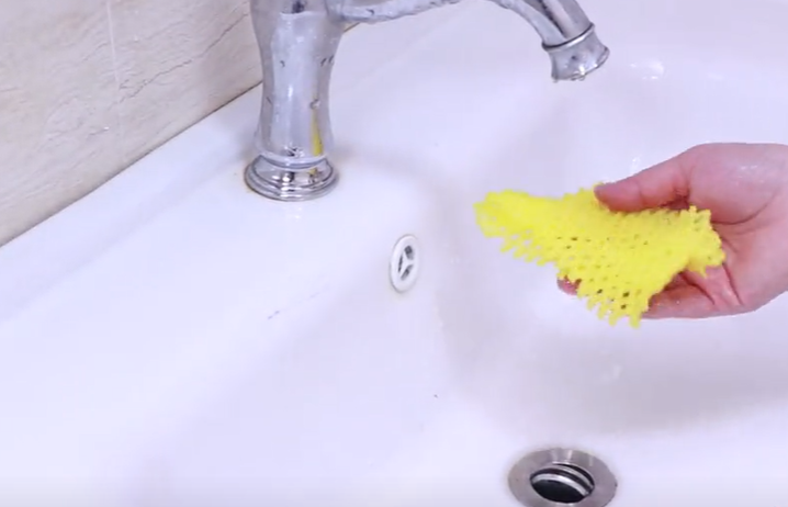 第二,水果网套可以快速的清洁洗手池里面的污垢。平时洗手池藏污纳垢,非常的脏,接下来我们直接借助水果网套来帮忙。我们蘸取点水用来擦拭,水果网套质地非常的柔软,不会留下任何的划痕,同时可以快速的增大一个摩擦力,快速地将洗手池污垢给它清除,用来做一个清洁工具非常的棒。