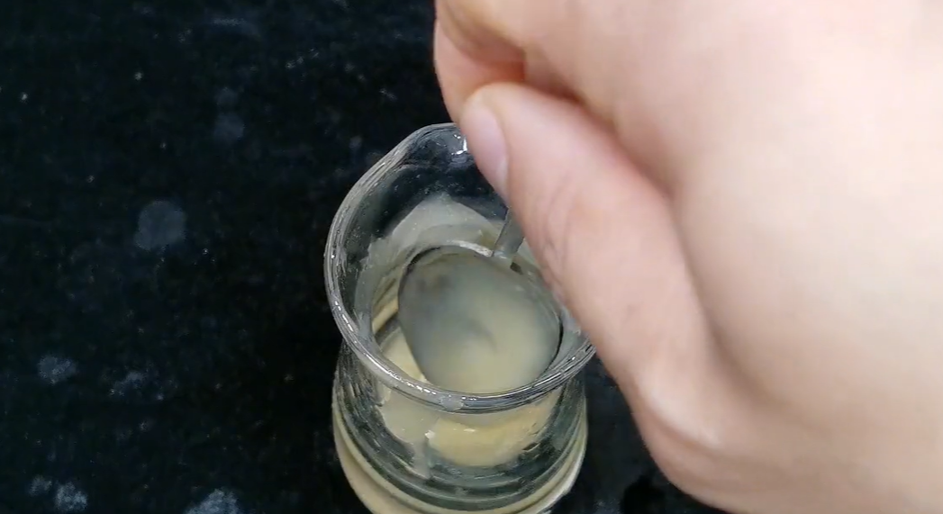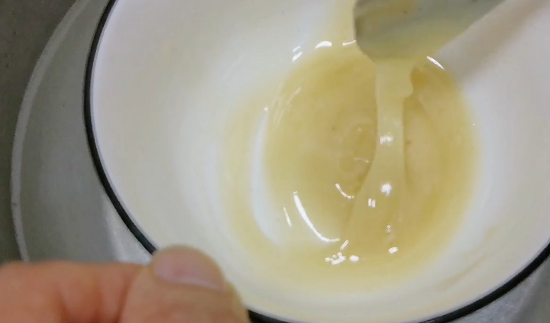 我这个是农村的纯土蜂蜜,大家看一下,它就像你家中熬的那个猪油一样,我们先挑一点出来,放入碗中用温水,大家记住一定是温水将它融化,因为温度过高会损害蜂蜜里面的营养素。蜂蜜化好后,这时候我们只需一只筷子就可以识别出它的真假。
